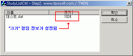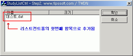 따라갑니다. 따라서 "이름" 항목은 왼쪽정렬되어 있고 "크기" 항목은 오른쪽 정렬되어 출력됩니다. 그리고 항목 추가시 item 정보에 항상 0이 설정되어 추가되기 때문에 추가되는 항목이 리스트컨트롤의 첫번째항목으로 추가되고 이전 항목은 아래쪽으로 하나씩 밀려나게 됩니다. 즉, 위 그림에서 "테스트01.dat"라고 입력한 항목이 가장먼저 입력된 항목이고 "팁스소프트.dat" 항목이
