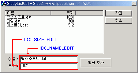 add_item.iItem = 0; // 지정된 위치의 항목에서 2번째 컬럼에 정보를 설정한다. ( "크기" 컬럼 ) add_item.iSubItem = 1; // "크기" 컬럼에 설정될 문자열을 명시한다. add_item.pszText = "1024"; // 리스트컨트롤의 항목 정보를 변경한다. m_my_list.SetItem(&add_item); ![]() 이제 예제를 약간 수정해서 "이름"과 "크기"를 입력받을수 있는 컨트롤을 추가하고 "항목 추가"라는